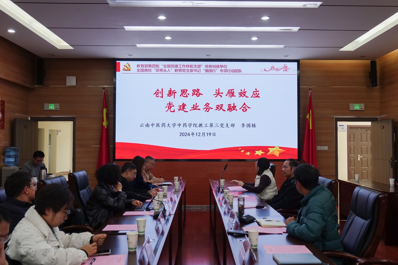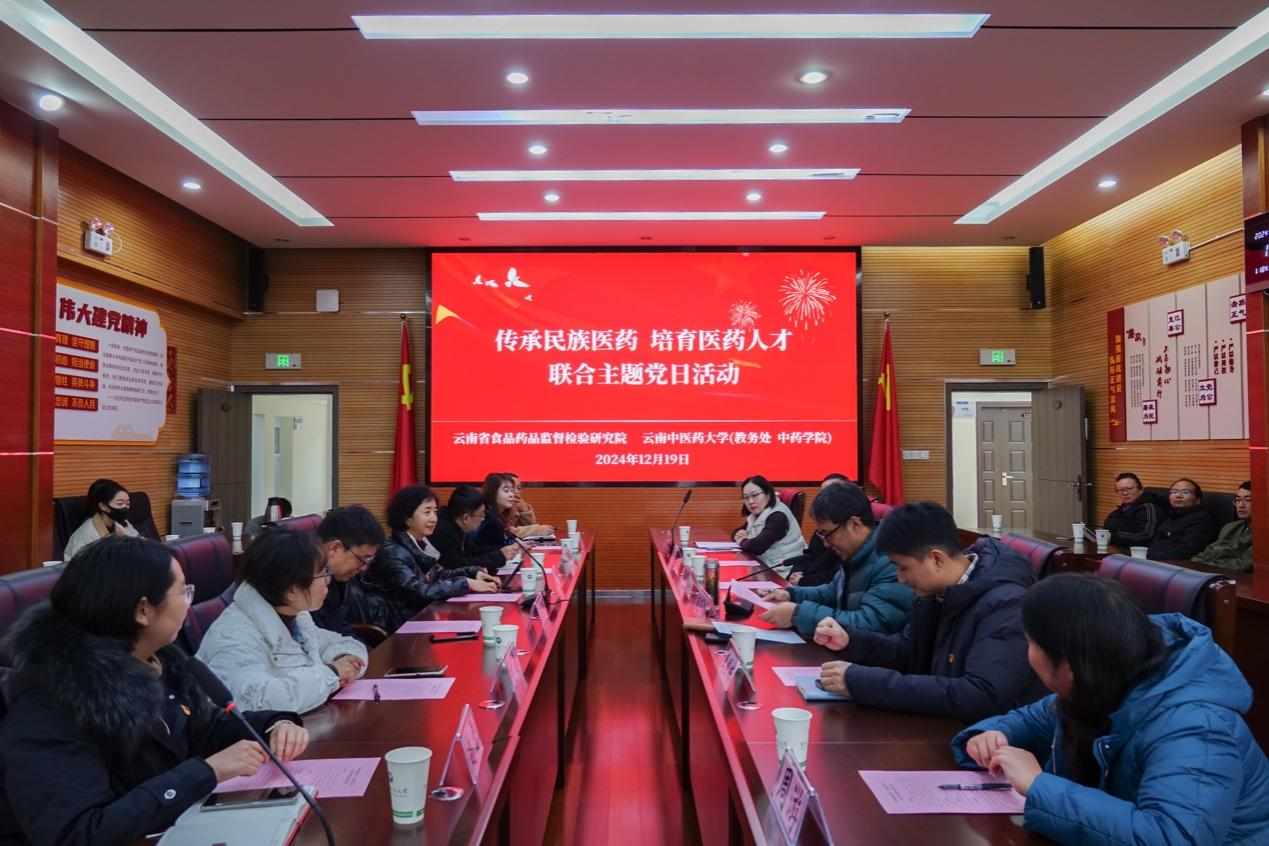 2024年12月19日,教务处党支部、中药学院教工第一党支部、第三党支部、云南省食品药品监督检验研究院4个党支部联合开展了“传承民族医药 培育医药人才”主题党日活动,陈祖琨副校长到会指导,云南省食品药品监督检验研究院院长李哲媛及相关党支部的党员参加了本次活动。此次活动旨在深化党建引领,加强中药学、生物医药等专业实践育人工作,提升实践教学质量,推动实践教学基地建设。