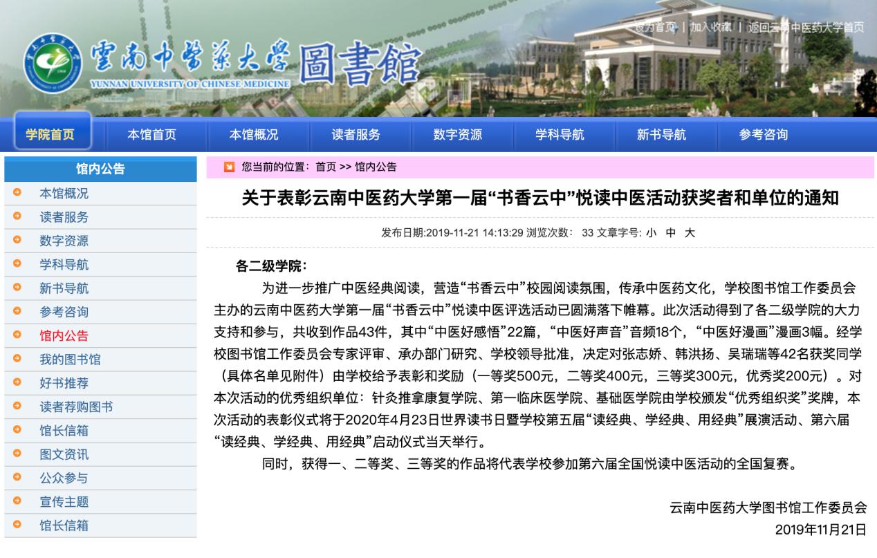 6.为进一步推广中医经典阅读,传承中医药文化,学校组织全校广大师生组织开展了云南中医药大学第一届“书香云中”悦读中医评选活动暨第六届全国悦读中医活动选拔活动,从43份作品(“中医好感悟”22篇,“中医好声音”音频18个,“中医好漫画”漫画3幅。)中最终评选出一等奖6名,二等奖6名,三等奖10名,并代表学校参加第六届全国悦读中医活动的全国复赛。学校还组织了每月“阅读之星”评选活动,通过“读经典、学经典、用经典”系列主题活动,既丰富大学生的大学学习生活,也推进大学校园的国家通用语言文字宣传和普及工作。